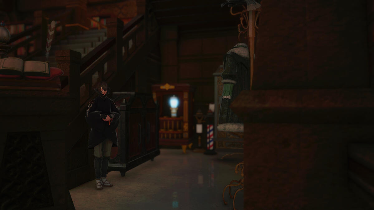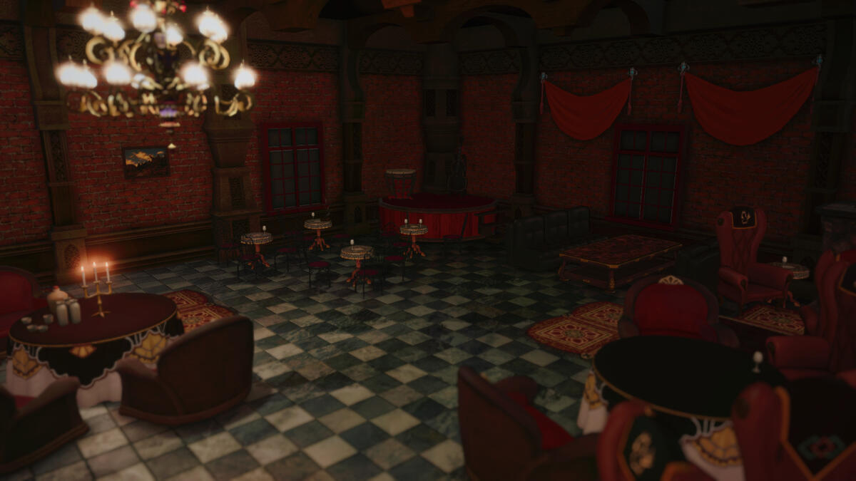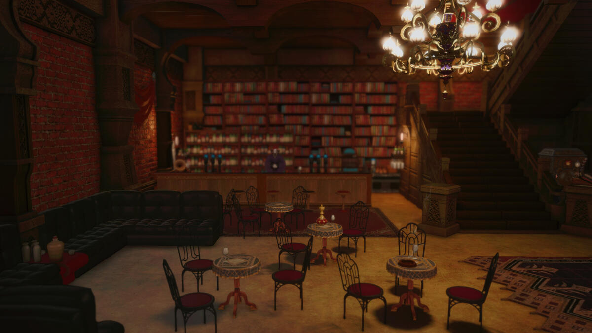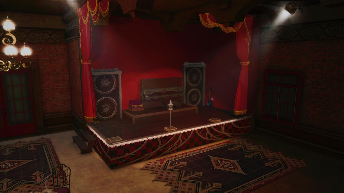 The stage, with its upright piano, microphone and speakers of Garlean design, lend themselves to amplifying live performances. The bar's Watch2gether plays Jazz music during opening nights. During off-hours, the orchestrion is loaded with Eorzea's jazziest tracks.